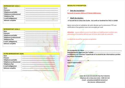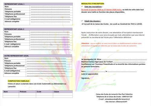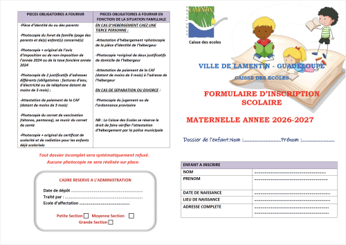 La Ville de Lamentin informe les parents de l’ouverture de la campagne d’inscriptions scolaires en écoles maternelles (TPS à GS) pour la rentrée 2026/2027.