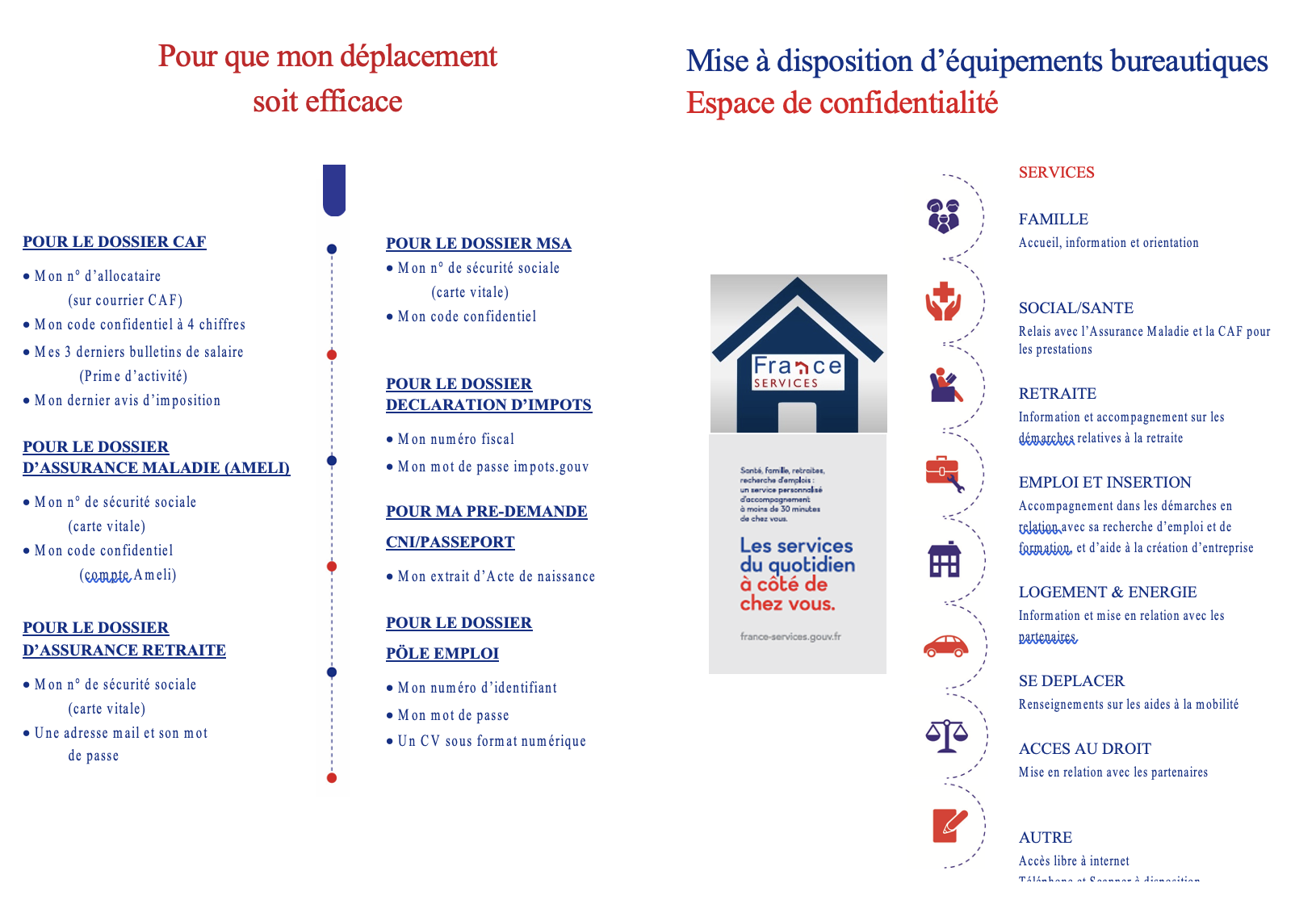 Les services publics plus près de chez vous ! Il s’agit d’un nouveau modèle d’accès aux services publics pour les démarches du quotidien. Cet espace vise à permettre à chaque citoyen quel que soit l’endroit où il vit, en centre-bourg ou à la campagne, d’accéder aux services publics et d’être accueilli dans un lieu unique, par des personnes formées et disponibles, pour effectuer ses démarches du quotidien.