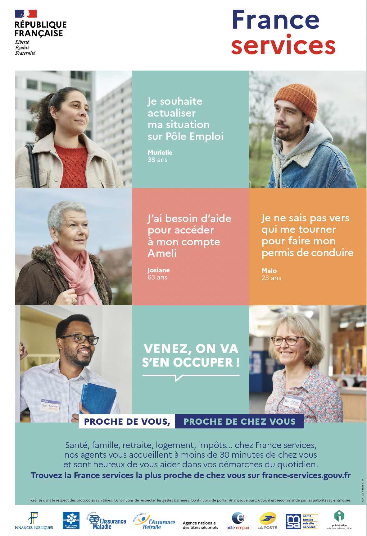 France Services, c’est avant tout un guichet unique qui donne accès dans un seul et même lieu, moderne et convivial, aux principaux organismes de services publics : le ministère de l’Intérieur, le ministère de la Justice, la Direction Générale des Finances Publiques, Pôle emploi, l’Assurance retraite, l’Assurance maladie, la CAF, la MSA et la Poste. Ainsi, pour résoudre vos démarches les plus complexes, les chargés d’accueil peuvent s’appuyer sur leurs correspondants au sein du réseau de ces neuf partenaires nationaux mais aussi sur leurs partenaires locaux.