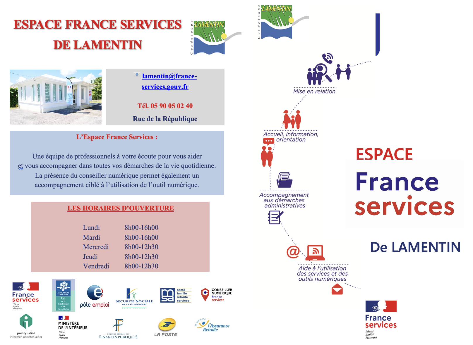 Besoin d’aide pour vos démarches administratives ? Immatriculation de véhicules, RSA, impôts, permis de conduire, accès à vos services en ligne… À moins de 30 minutes de chez vous, dans la commune de Lamentin, les agents de votre espace France Services sont formés et disponibles pour vous accompagner dans vos démarches du quotidien.