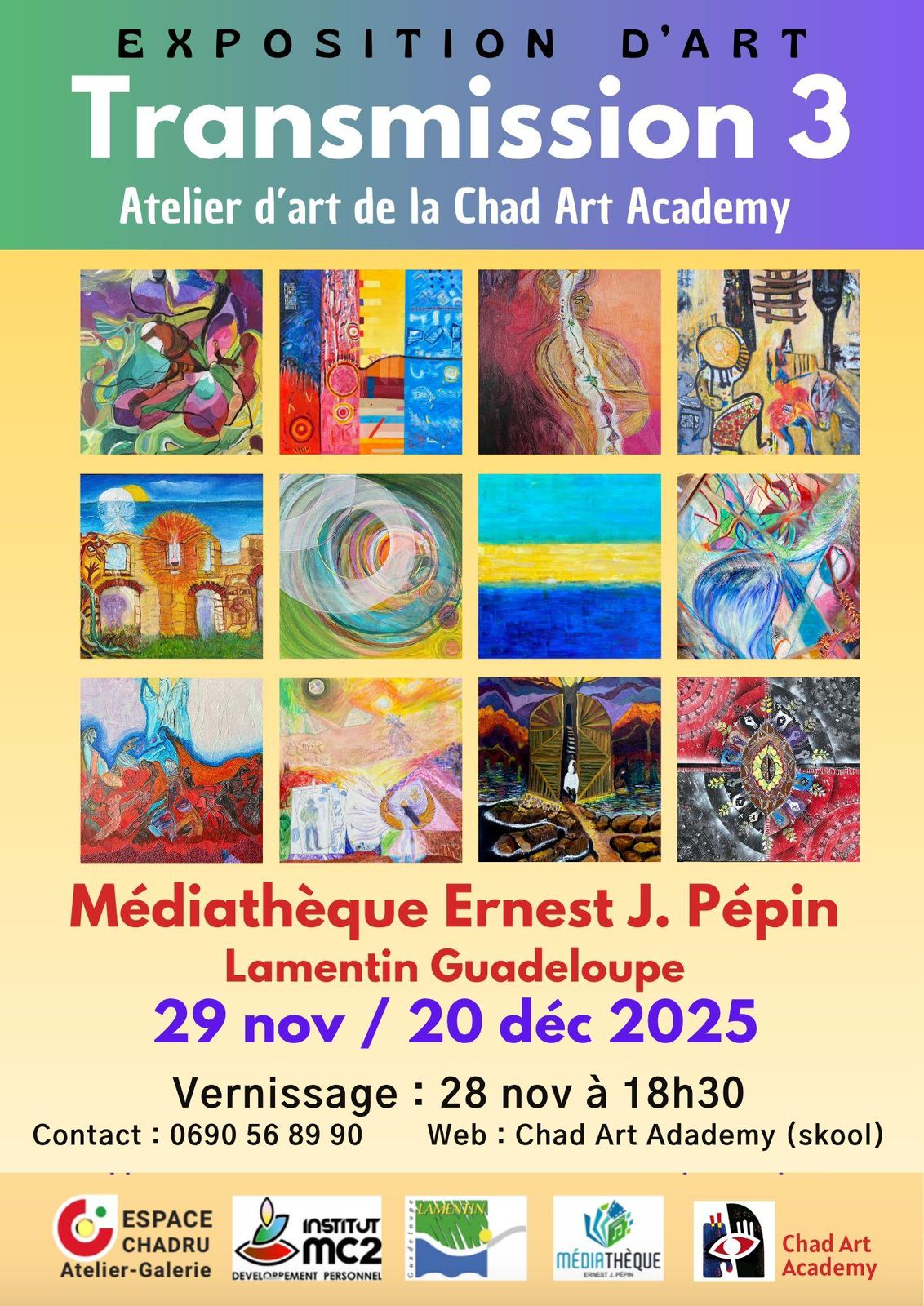 Venez nombreux assister au vernissage de l’exposition “TRANSMISSION 3”, réalisée par l’Atelier d’art de la Chad Art Academy, sous la direction de l’artiste Pierre CHADRU.